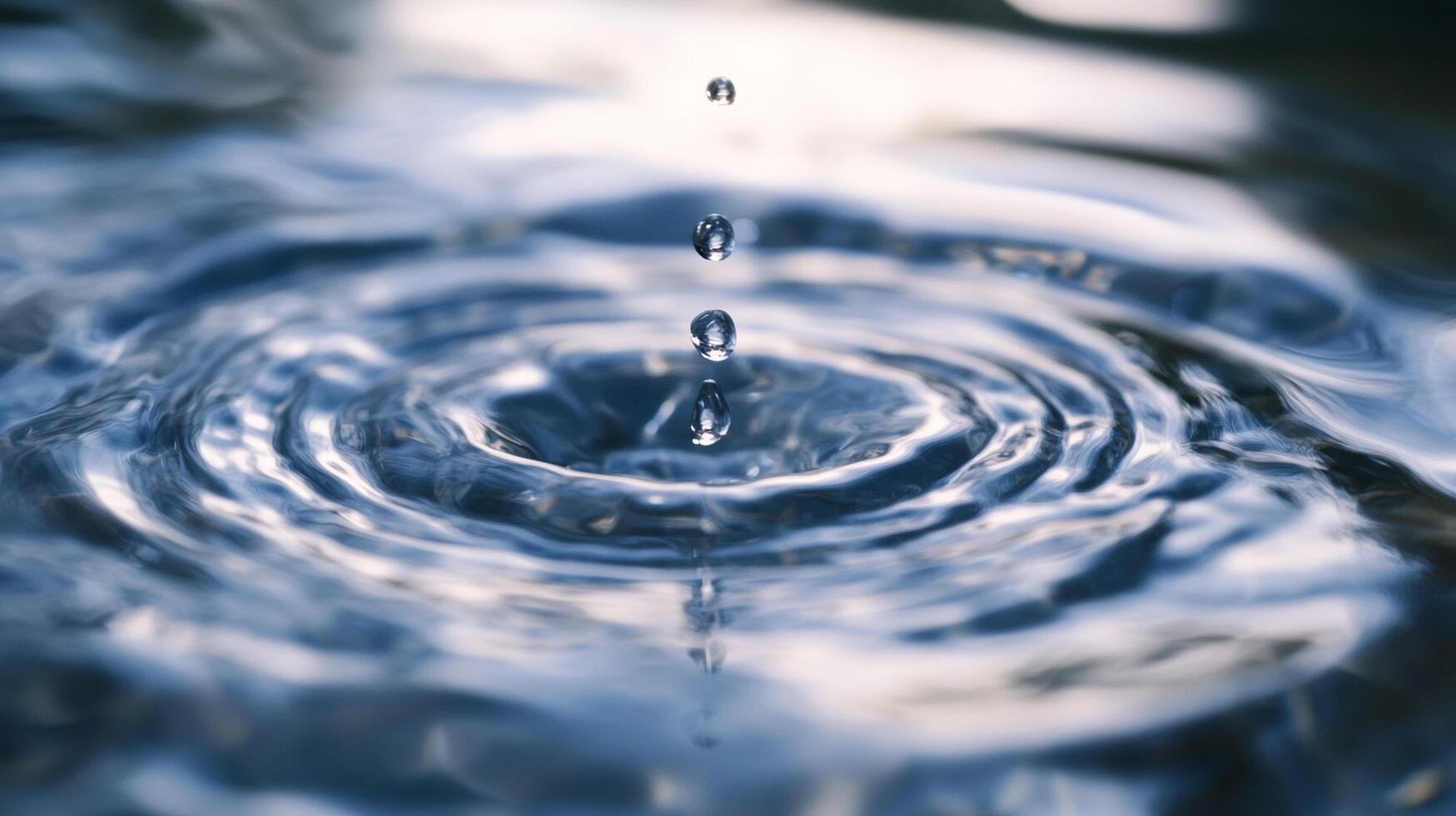 Water droplets falling into a pool creating ripples. A calming image of nature and serenity reflecting light and movement on a water surface. Free Photo