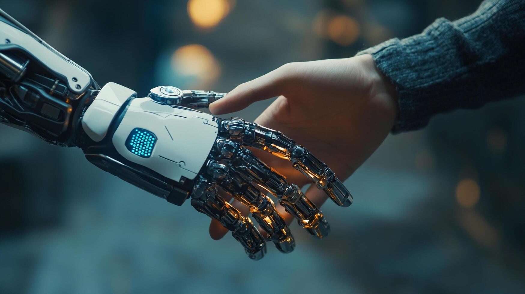 Human and robot shaking hands, symbolizing collaboration and future technology with mechanical precision in a blurred background. photo