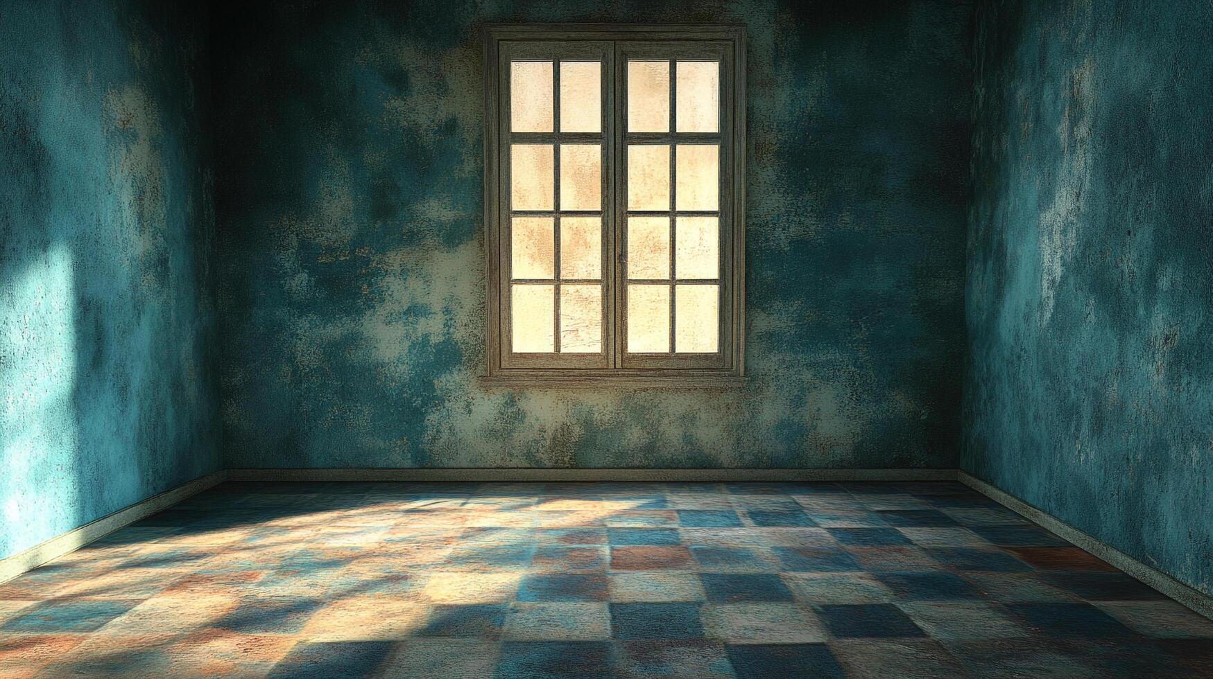 An empty room with teal walls is lit by light from a window. The floor is tiled in blue and brown squares creating sunlit patterns. Free Photo