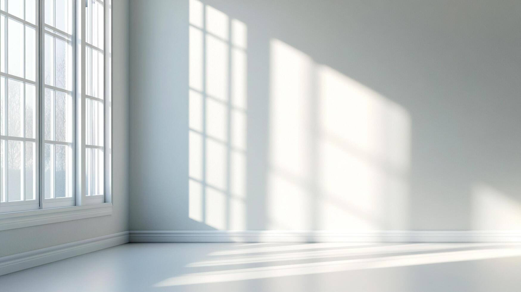 Bright room with sunlight streaming through the window creating shadows on the walls and floor. A minimalist and serene setting. Free Photo