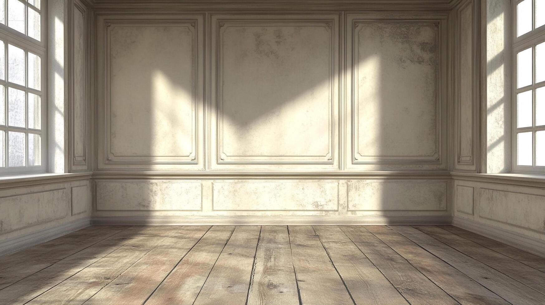 Sunlight streams into an empty room, illuminating its rustic wooden floor and paneled walls, creating a serene, inviting atmosphere. Free Photo
