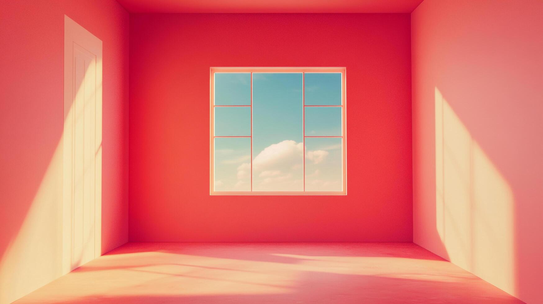 Sunlit window and a door cast shadows on the red walls of an empty room, with a view of blue sky and clouds through the window. photo