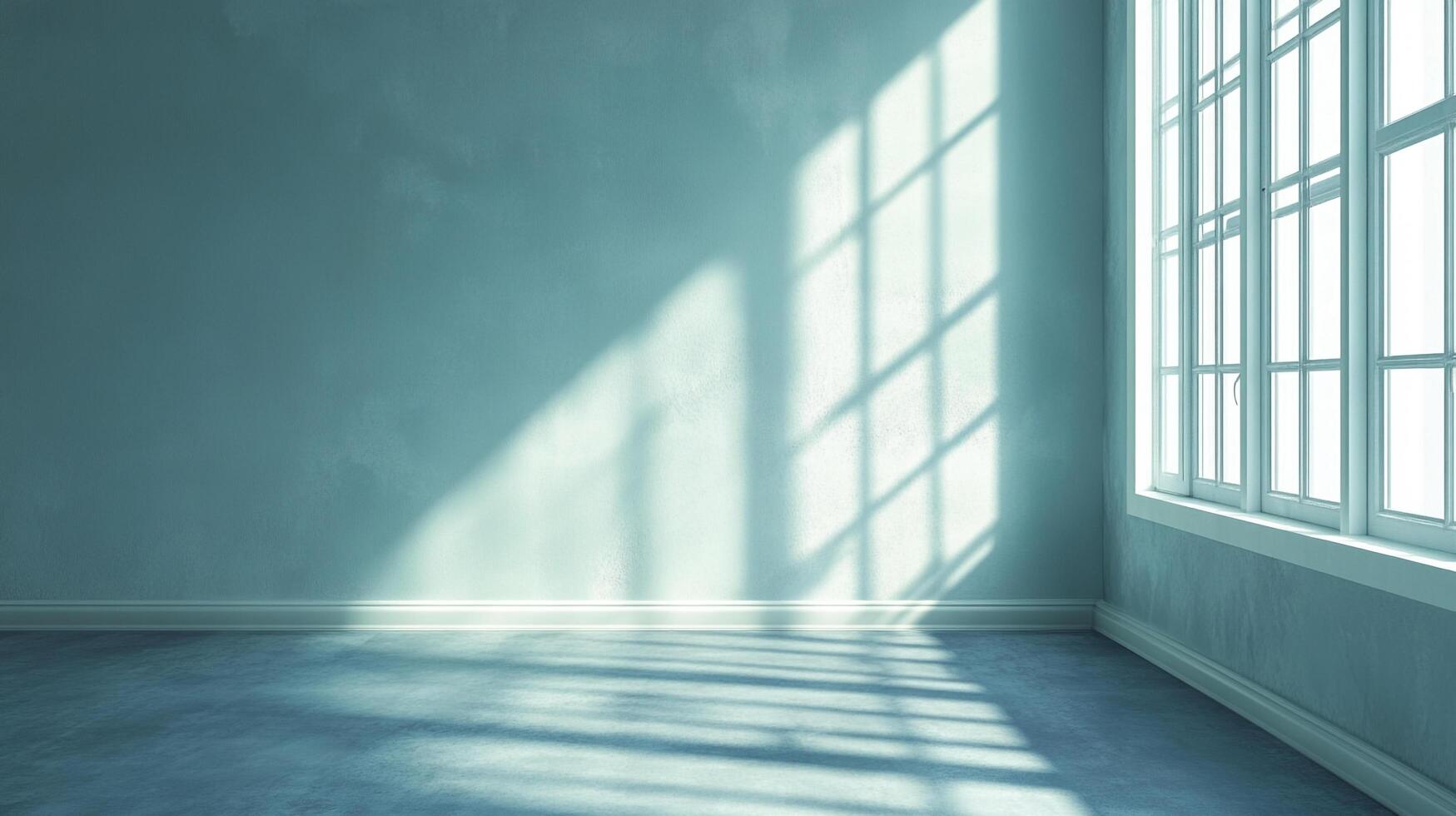 Sunlight streams into a spacious room through a multi-pane window, casting geometric patterns on the wall and floor, inviting warmth and serenity. photo