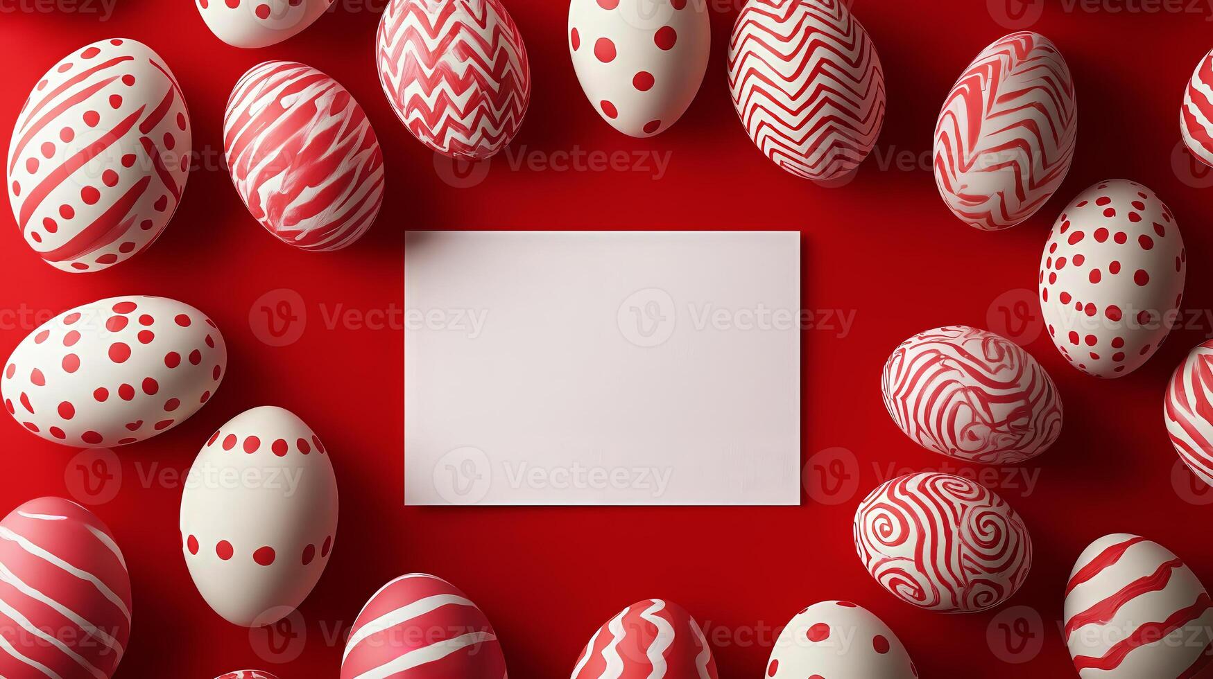 Red and white Easter eggs with abstract patterns and blank card on a red background, festive layout Pro Photo