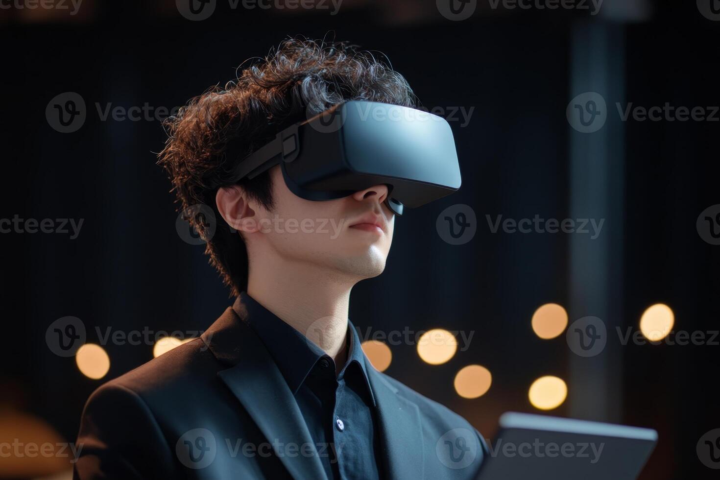Young man wearing virtual reality headset in modern environment with ambient lighting while exploring digital content Pro Photo