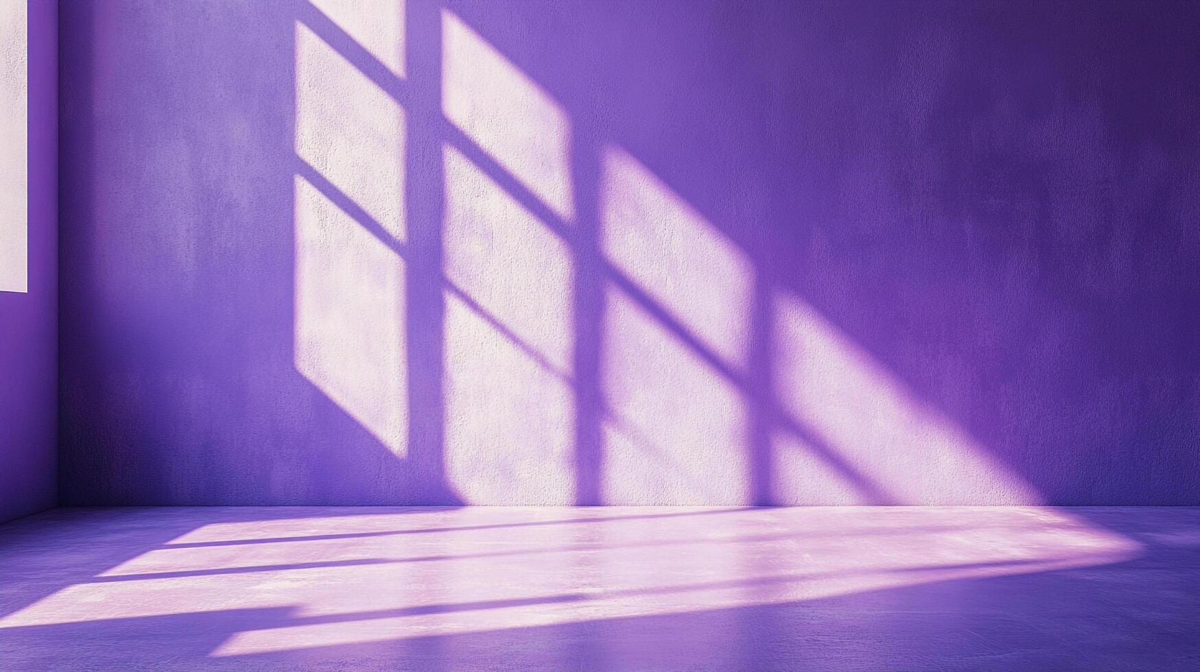Sunlight paints geometric patterns on a serene purple room, casting linear shadows across the wall and floor, creating a calming atmosphere. photo