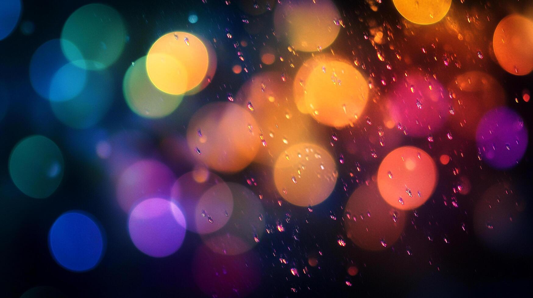 A colorful bokeh effect with vibrant circles of light overlapping against a dark background, also featuring water droplets on a surface. Free Photo