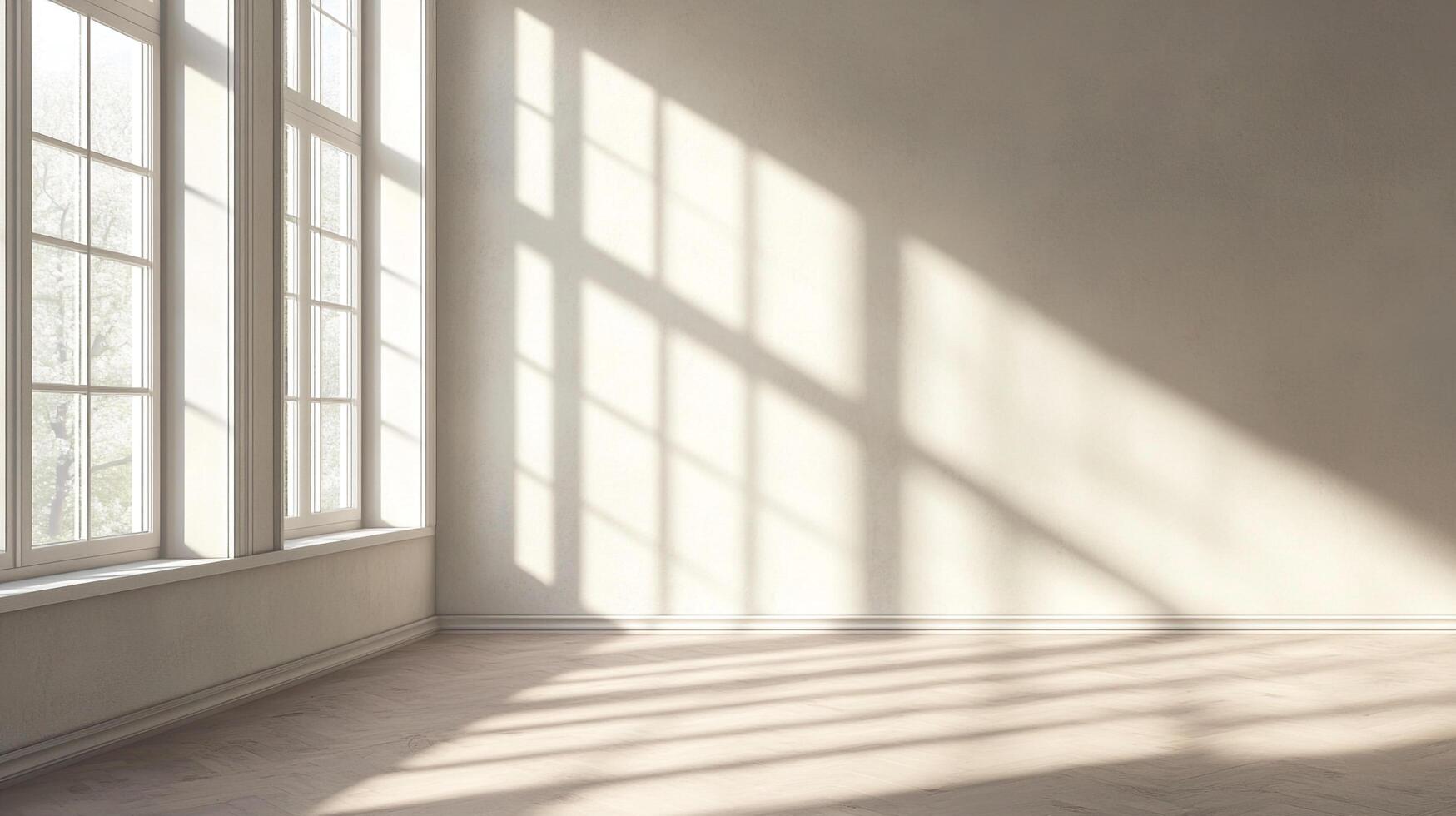 Sunlight streams through windows, casting geometric patterns on the empty room's wall and wood floor, creating a serene and inviting atmosphere. photo