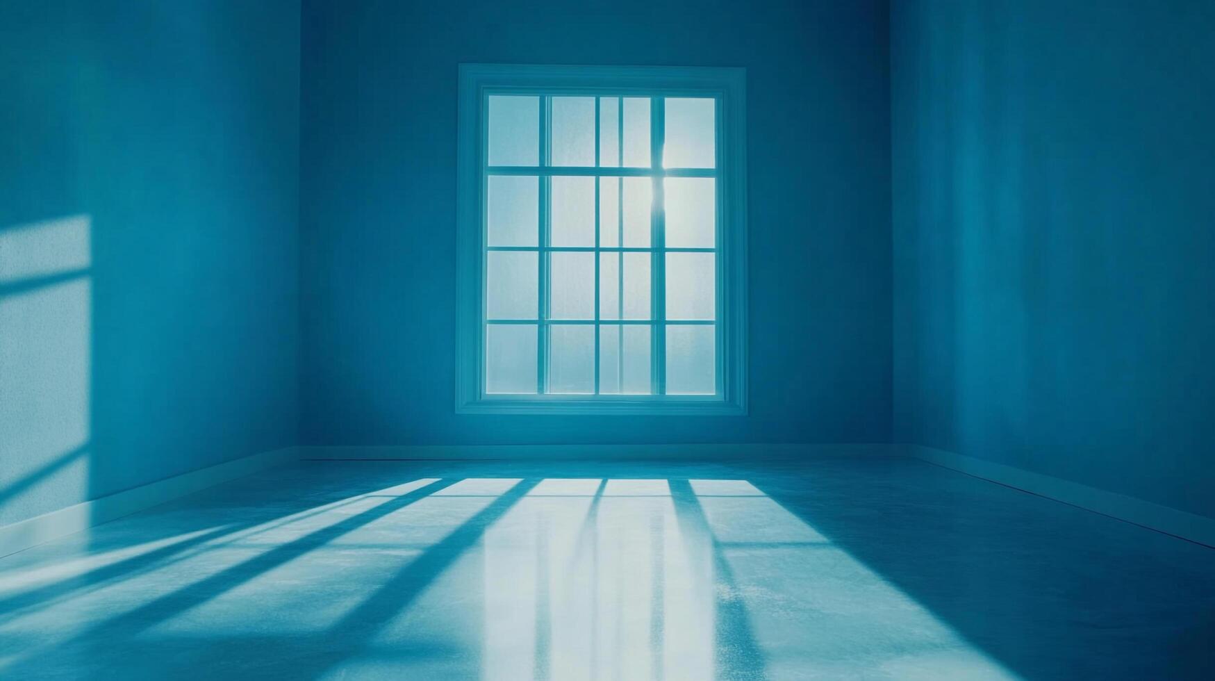 Monochromatic blue room with light streaming from a window creating linear shadows across the empty floor offering a minimalist aesthetic photo