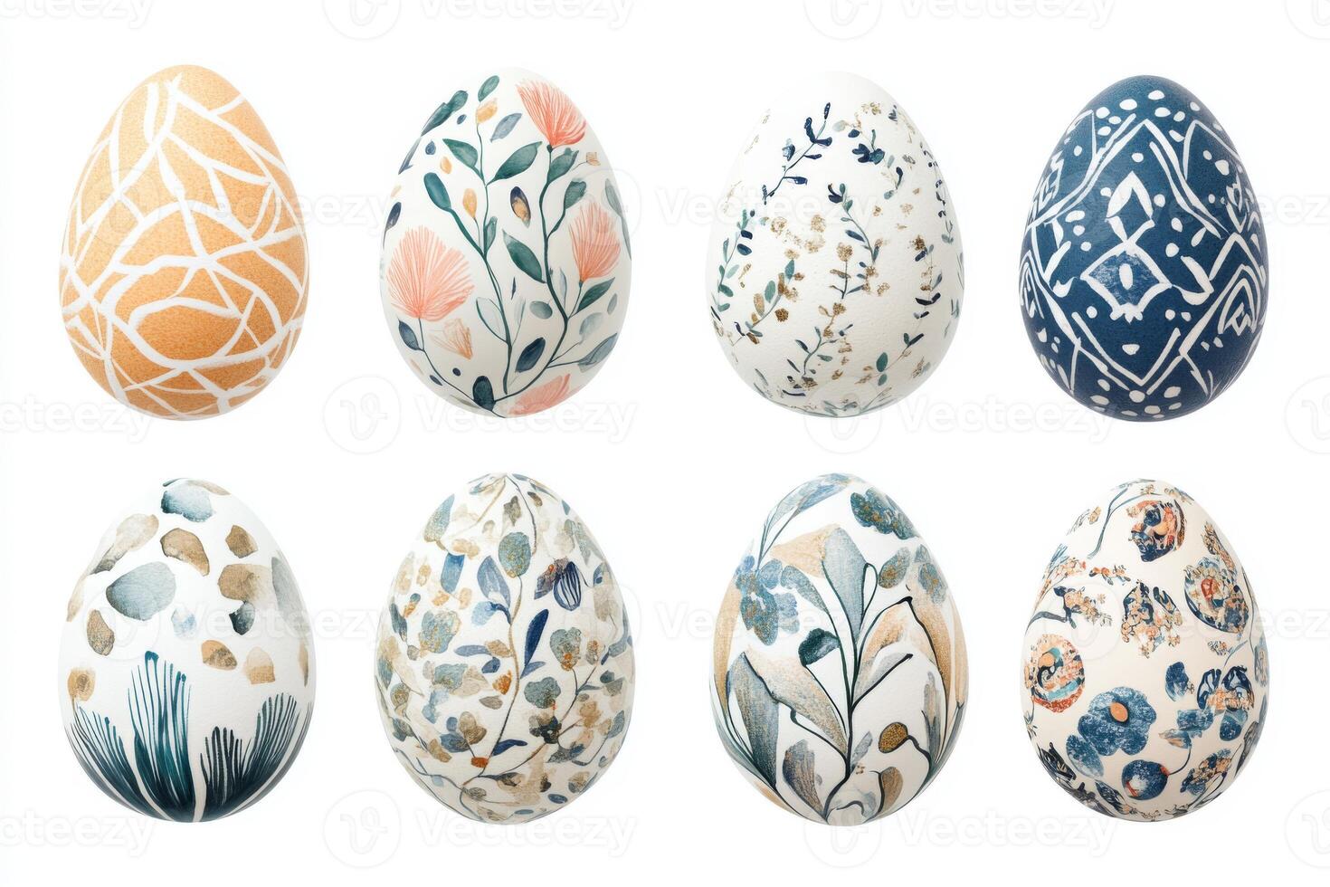 Neutral colors Easter eggs with folk motifs isolated on white background showcasing various designs and patterns in a beautiful arrangement Pro Photo