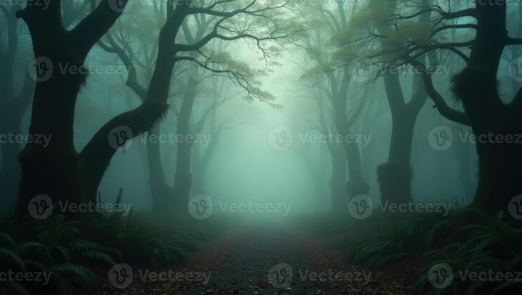 A path through a foggy forest with trees Pro Photo