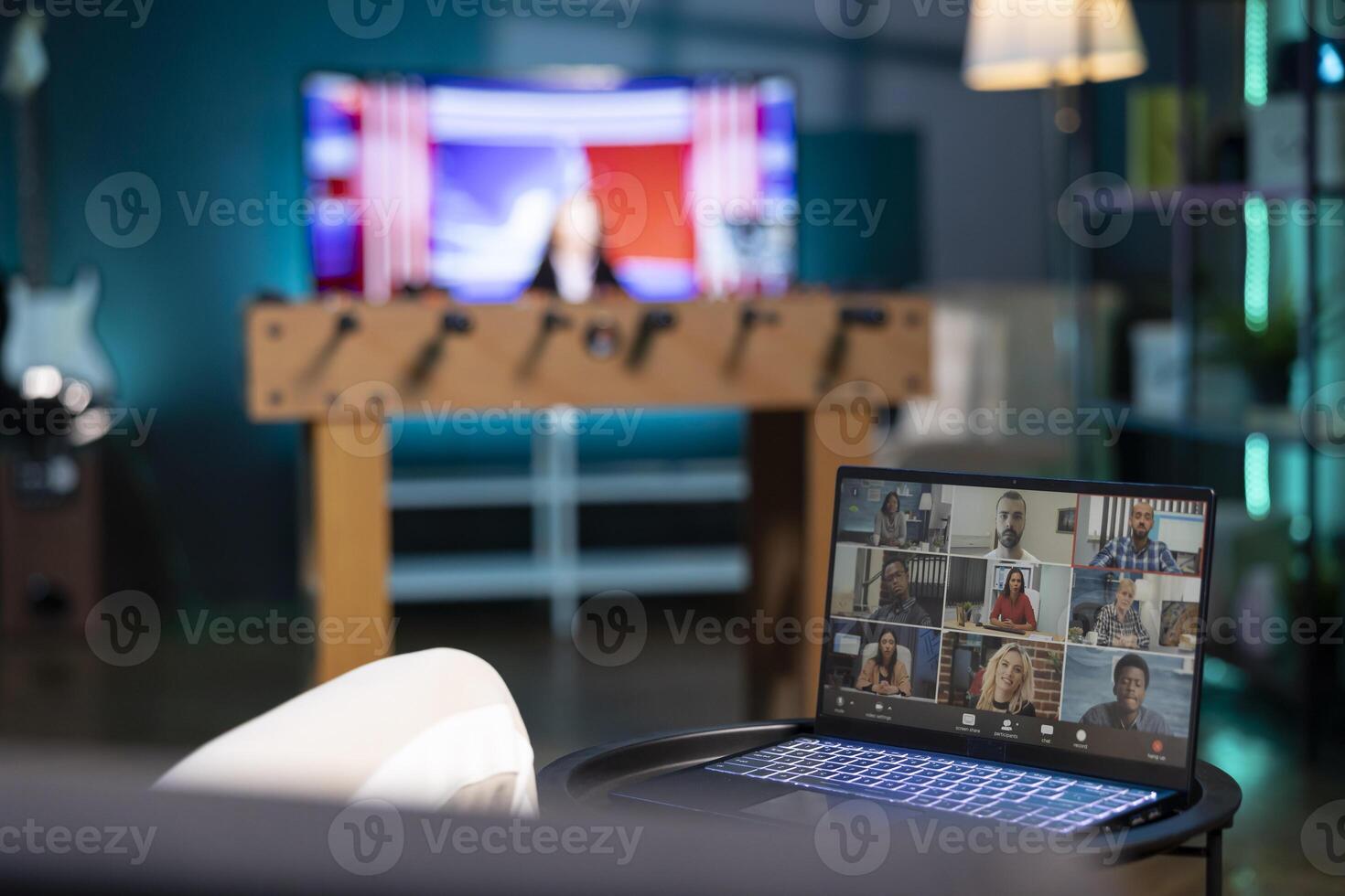 Teleworker and coworkers in call crosschecking analytics statistical data sets in dimly lit apartment office. Employee optimizing key performance indicators with colleagues in videocall Pro Photo