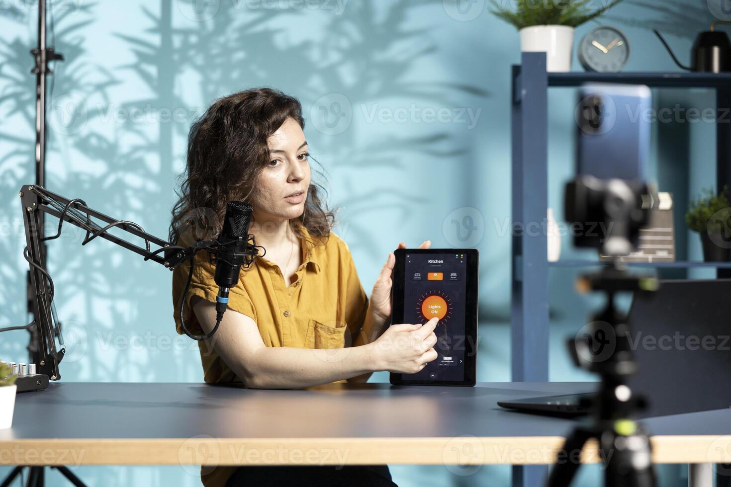 Tech guru in studio doing smart light bulb tablet application presentation for online streaming platforms. Media star hosting show, presenting IoT home automation product technology Pro Photo