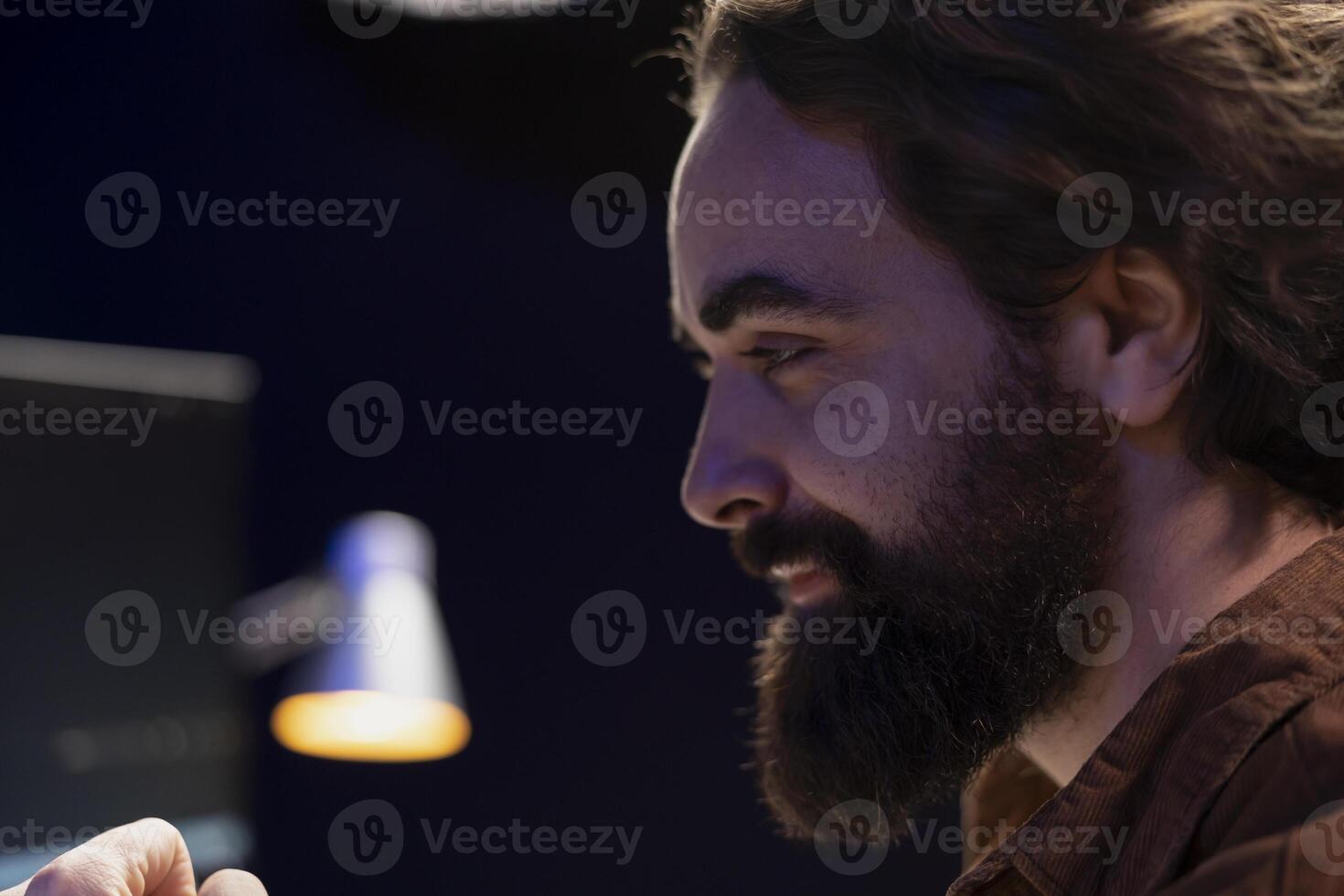 Joyous developer showing happiness after securing company servers from virus attacks. Smiling IT remote employee feeling positive emotions after succeeding building firewalls protecting data Pro Photo