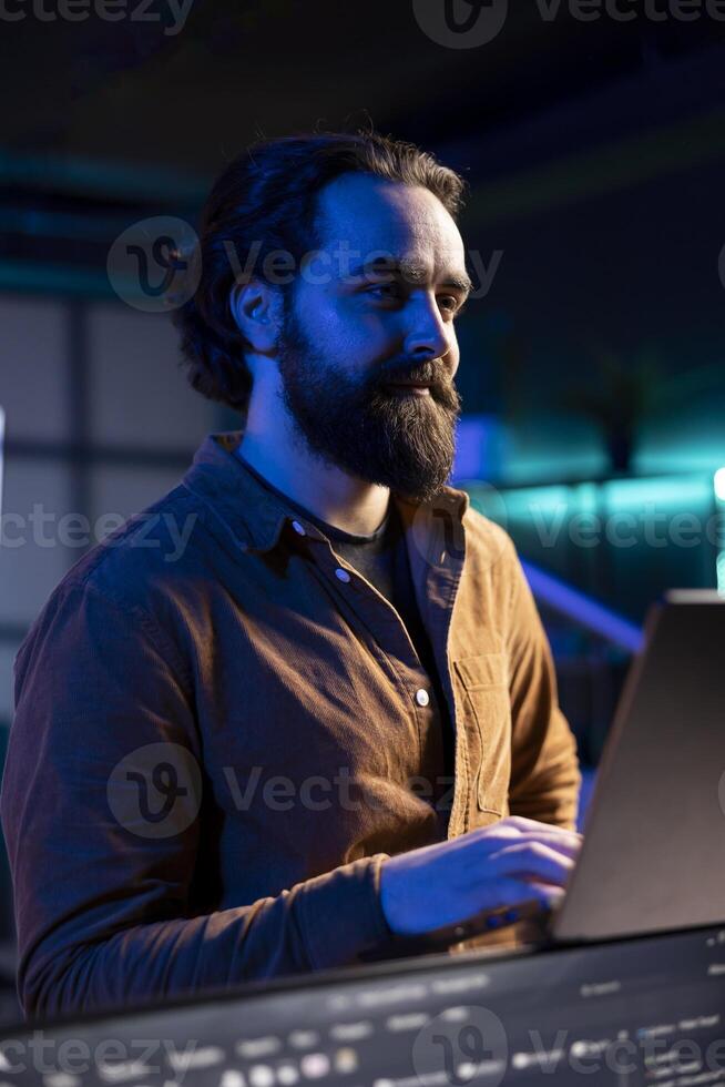 Cheerful admin satisfied after futureproofing company network from downtimes and unexpected system failures using laptop. Upbeat IT expert pleased after increasing data security using notebook Pro Photo