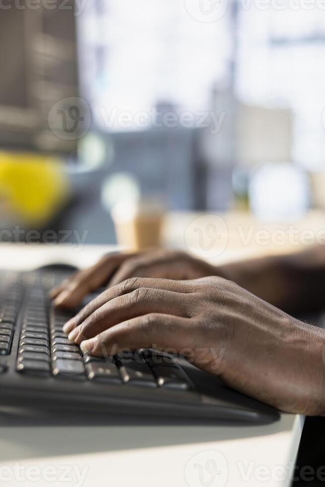 Startup employee sitting at desk in office, typing on keyboard, solving project with deadline approaching. Close up of person writing code at computer in workspace, solving tasks during job shift Pro Photo