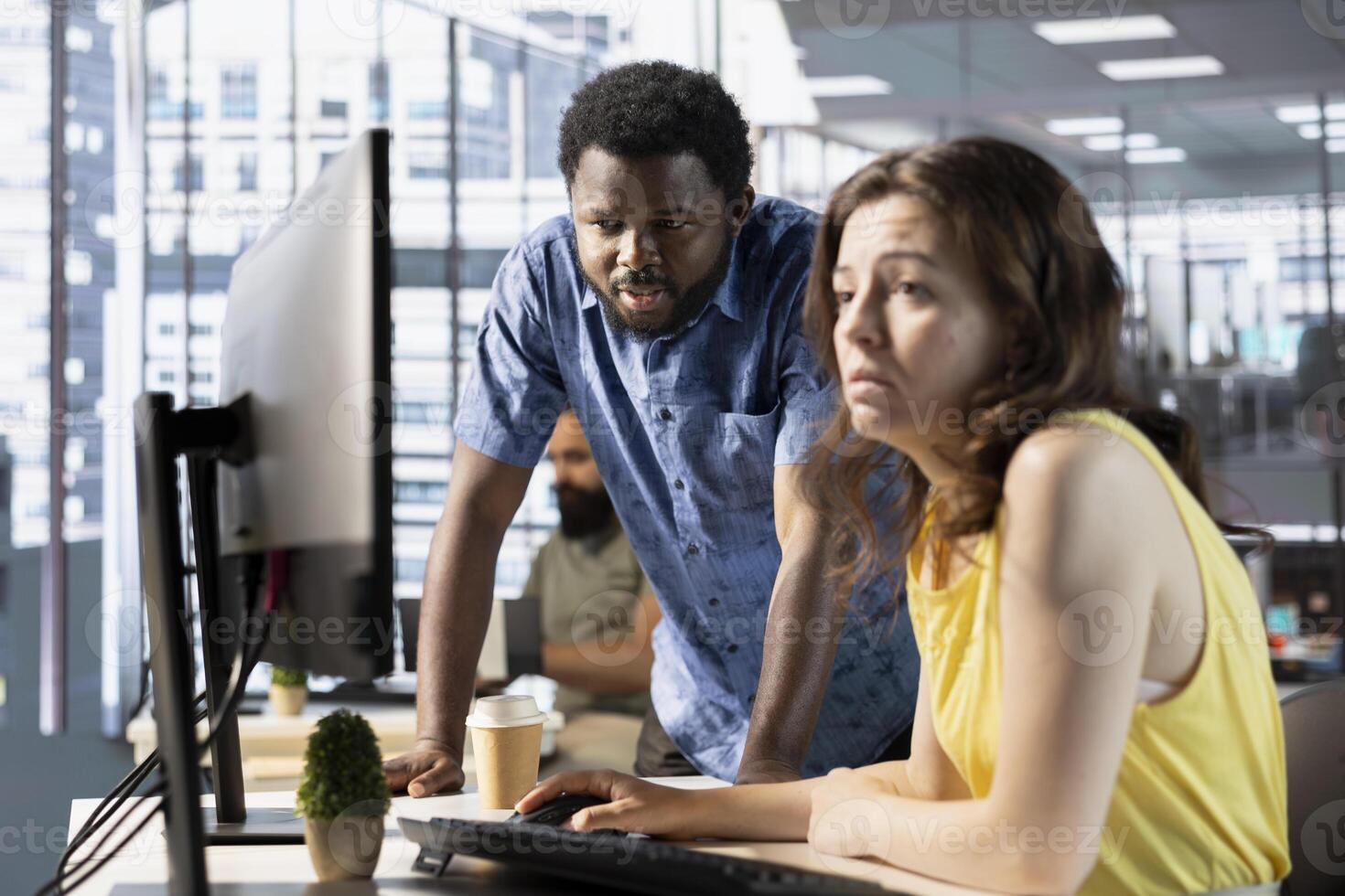 Developer and colleague doing brainstorming, fixing applications issues, dealing with databases and server configuration. IT expert and coworker optimizing company software for improved performance Pro Photo