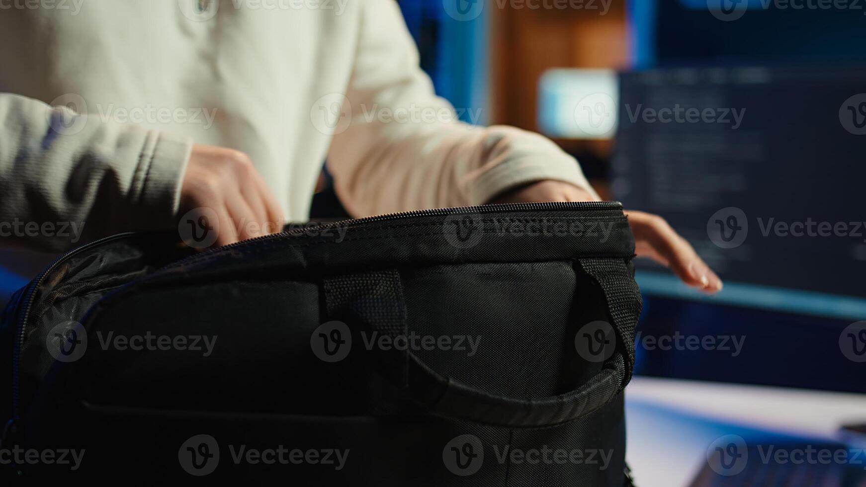 Computer scientist unpacking laptop bag, preparing to design and develop software applications. IT professional starting job shift, opening notebook to do coding, camera B Pro Photo