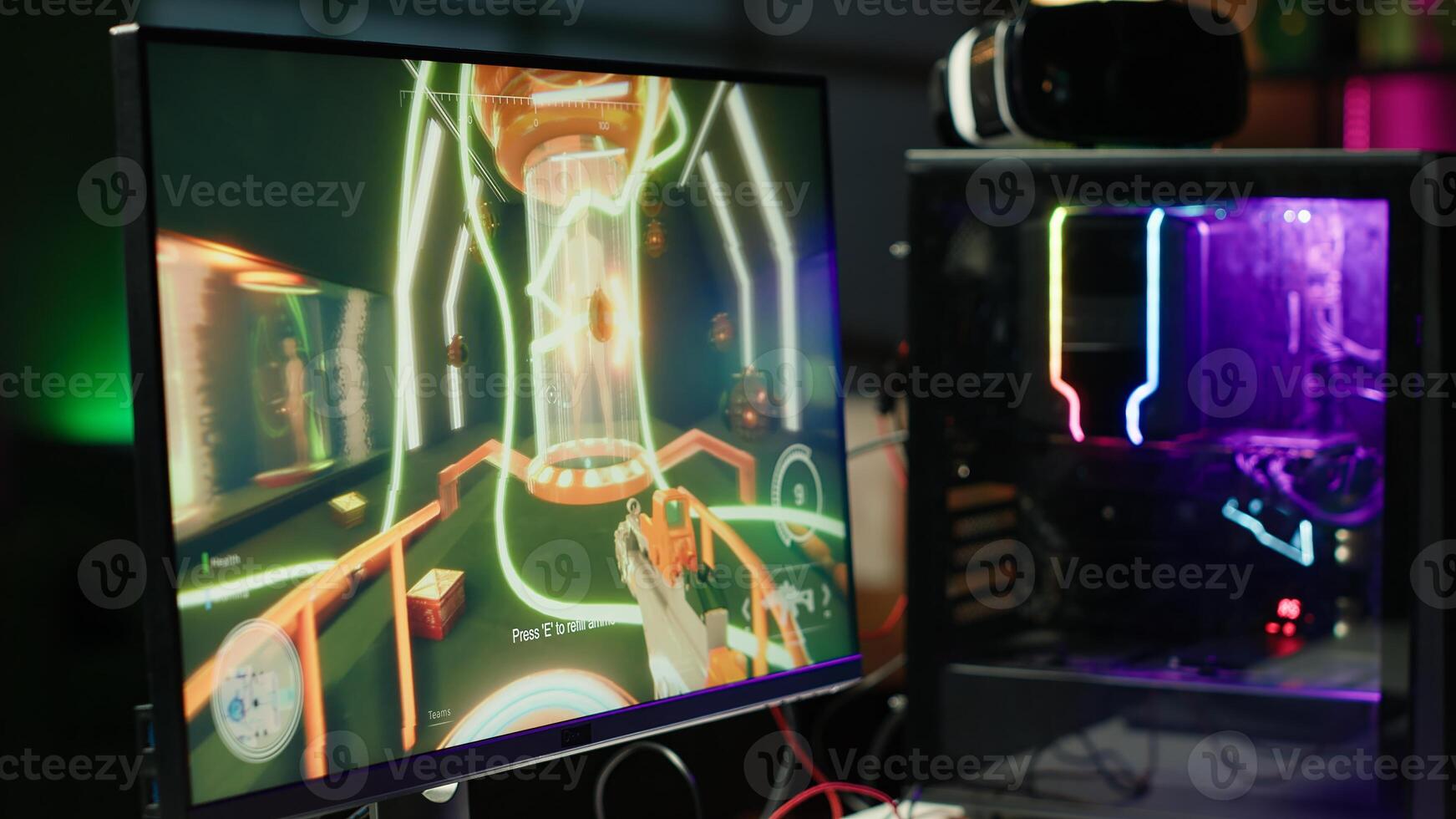 Videogame with gun and health, stamina, ammo HUDs left open on PC monitor in empty neon illuminated apartment. Close up of first person shooter game on computer display in home room late at night Pro Photo