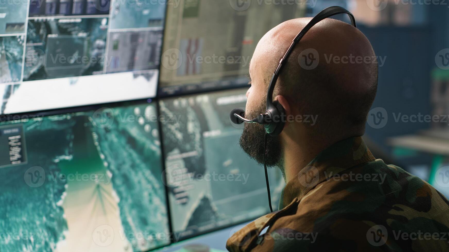 Army specialist working in war room operating surveillance tech, evaluating target data. Close up on dispatcher doing job in HQ base of operations, engaging enemy forces, camera A Pro Photo