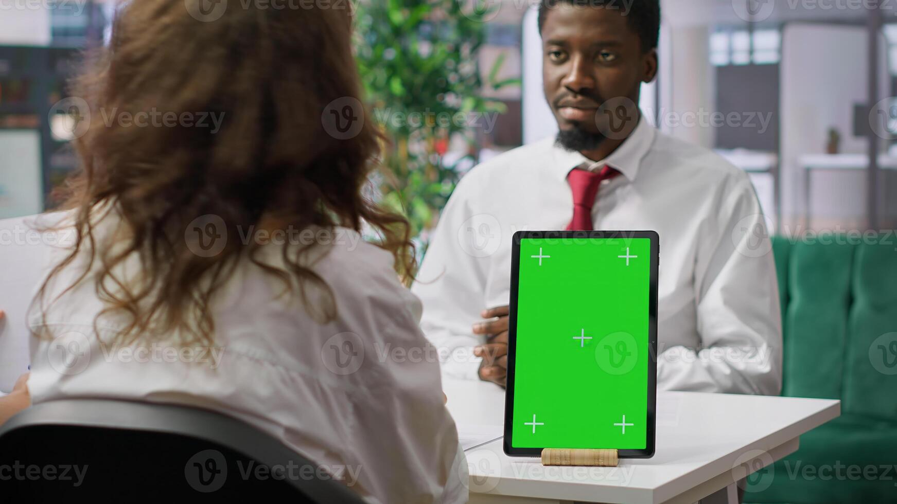 Job applicant and employer discussing in an interview with isolated mockup display on a device, high end corporate office. Businessman and HR recruiter share career development ideas. Camera A. Pro Photo