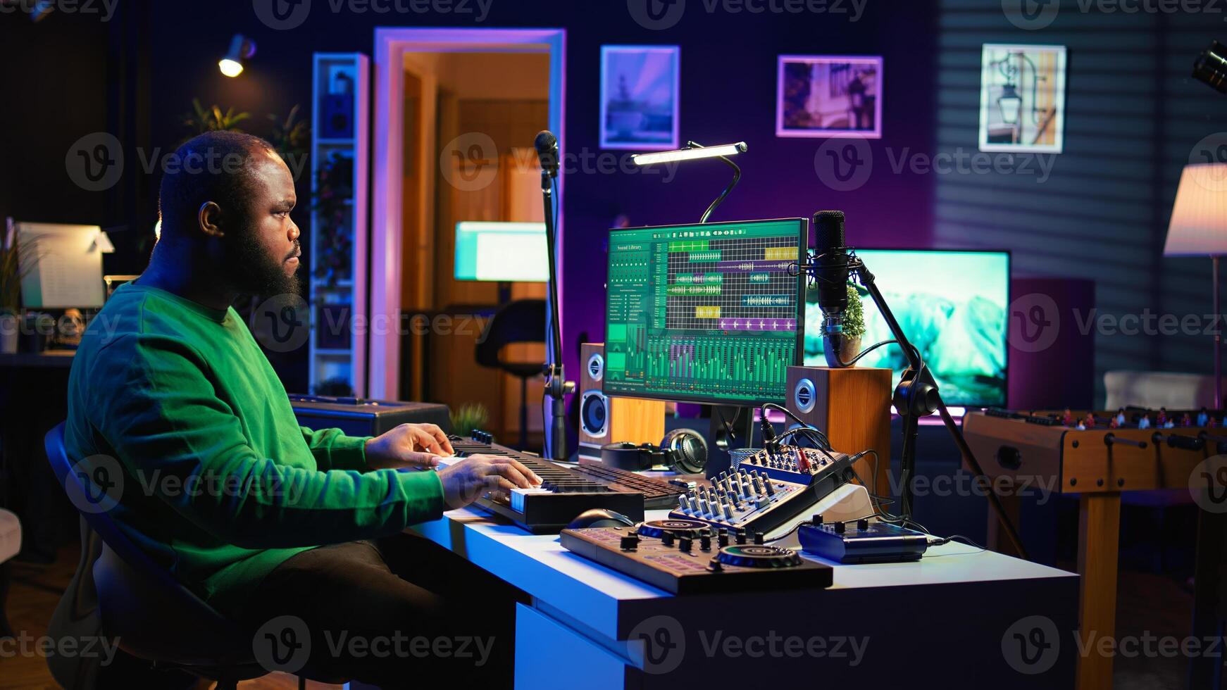 Sound engineer pressing keys of electronic synthesizer and composing new song, adjusting volume levels on pre amp knobs. Composer producing music on piano midi controller, mixing tunes. Camera B. Pro Photo