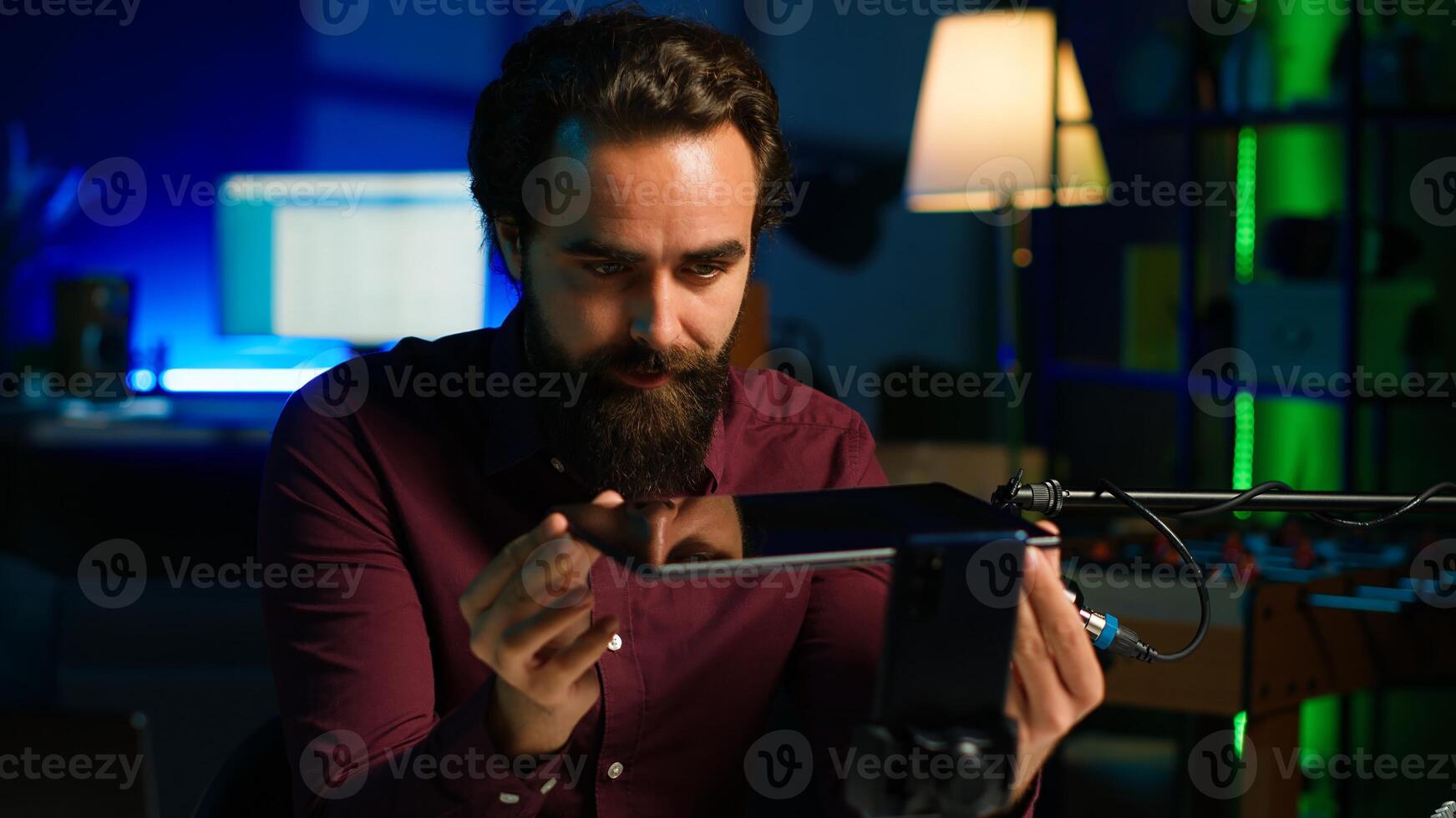 Tech specialist presenting tablet in entry level low budget price range to interested viewers, filming with smartphone on tripod. Man reviewing digital device, recording with mobile phone, camera A Pro Photo