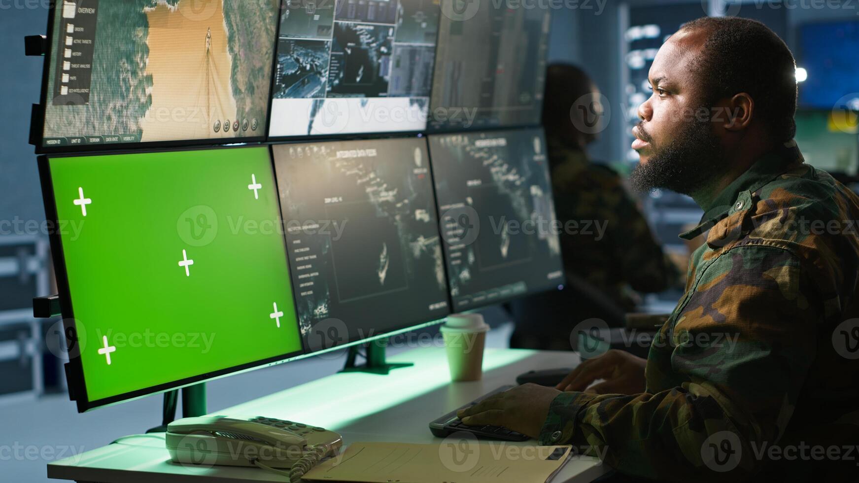 Military agent working in control room, using software on green screen devices, analyzing aerial reconnaissance data. Intelligence corps expert controlling drones with chroma key systems, camera A Pro Photo