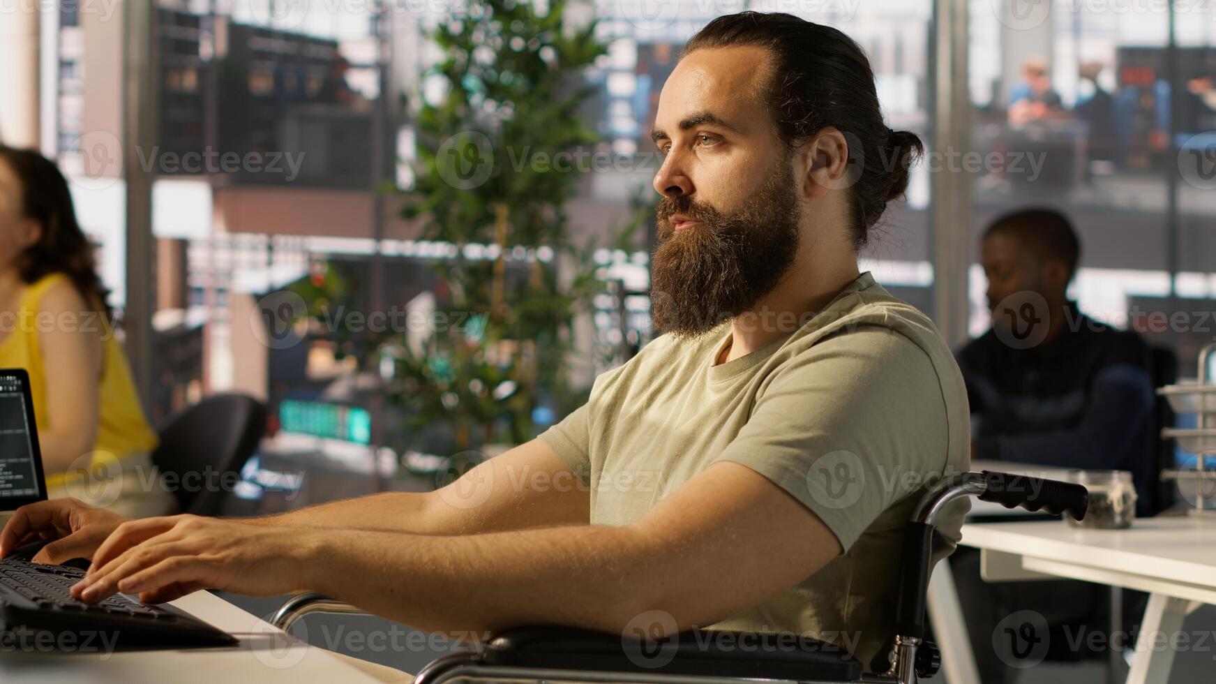 System administrator with disability in inclusive workspace training machine learning models. IT specialist with paraplegia monitoring and maintaining company systems, camera A Pro Photo