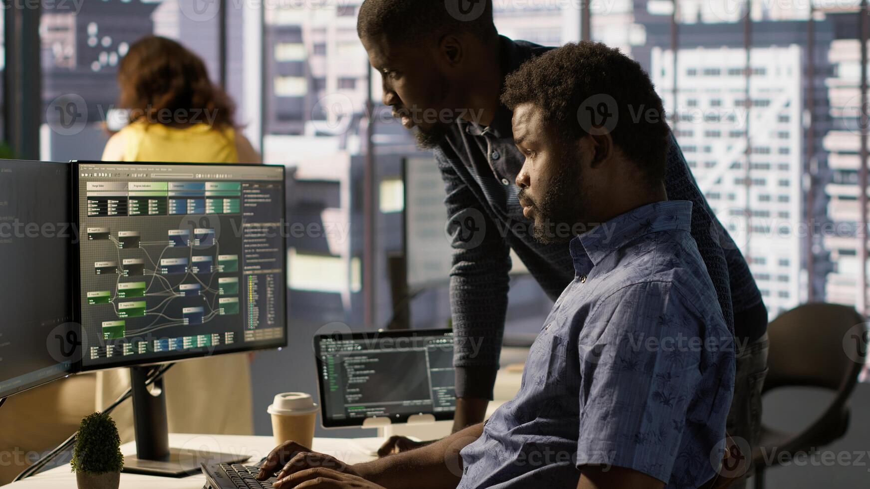 Developer working together with helpful colleague on artificial intelligence machine learning tech, improving company systems. IT specialist assisted by coworker to compare data Pro Photo