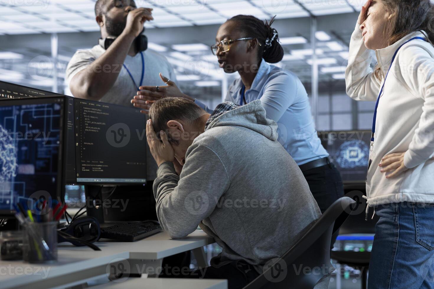 Employees berating engineer in office after mistake leading to errors in high tech AI data center. IT workers scolding admin in server farm after damaging artificial intelligence supercomputers Pro Photo
