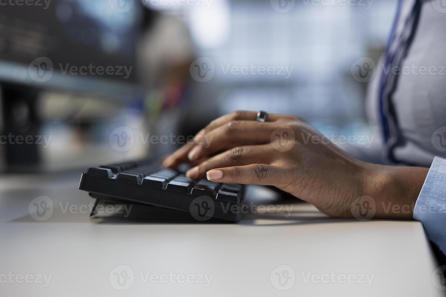 Engineer typing on keyboard, optimizing data center infrastructure for maximum efficiency and uptime. Close up of server hub IT expert maintaining optimal system performance, performing backups Pro Photo