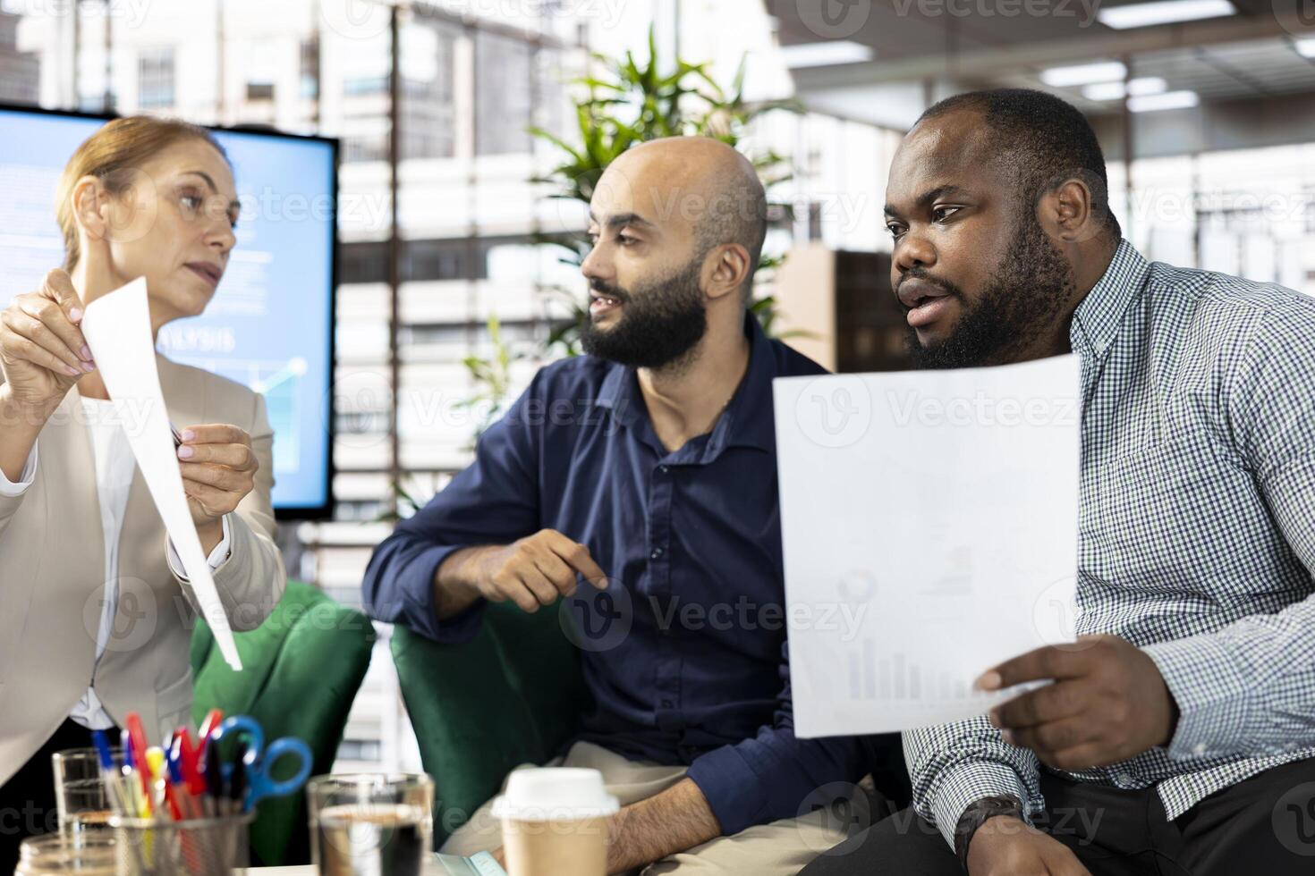 Office clerks reading company documents, checking progress on customer commissioned project. Workers cooperating to compare key data statistics on paperwork after business audit Pro Photo
