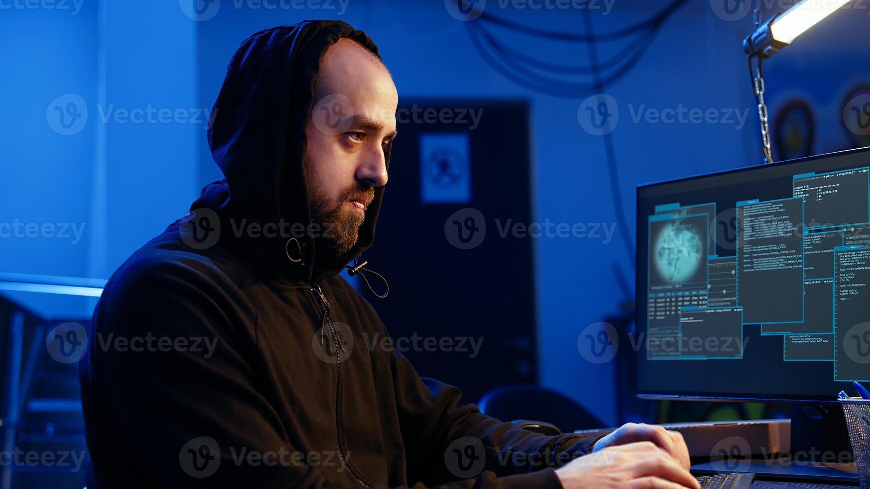 Hacker excited after finally developing zero day exploit undetectable by antivirus software installed on systems. Rogue programmer happy to successfully trick firewalls, celebrating accomplishment Pro Photo