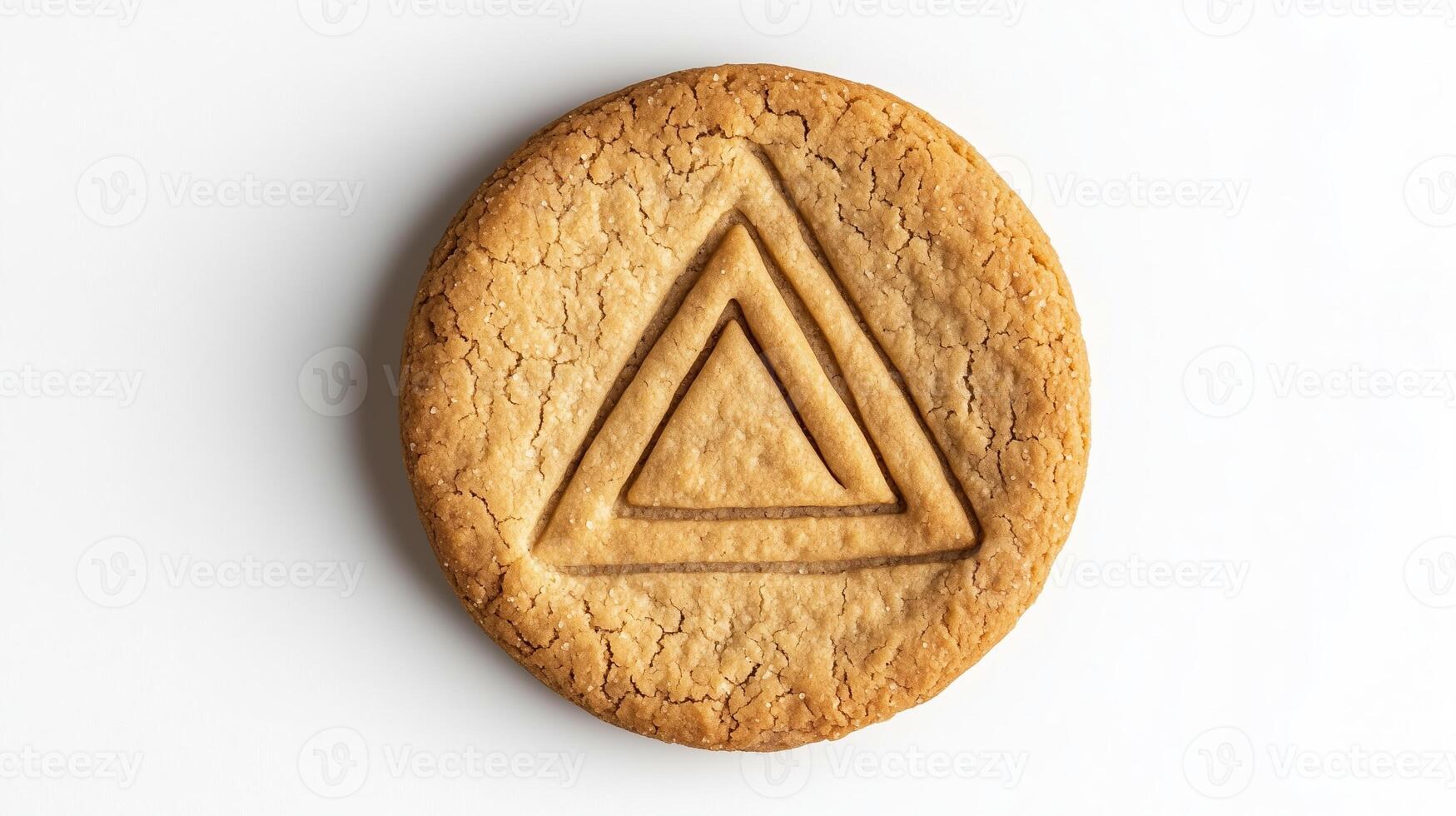 Circular cookie with the triangle simple icon on it, isolated on solid white background. 8 Pro Photo