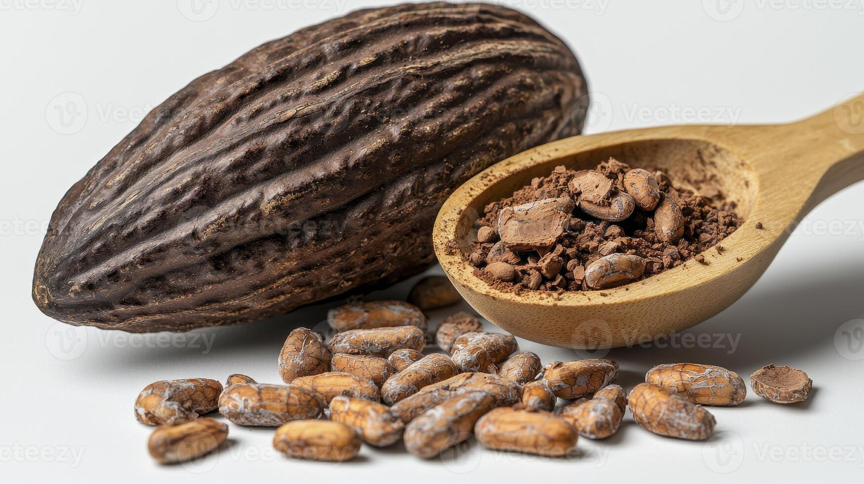Explore the rich and captivating world of cacao with this stunning image showcasing the raw bean, fragrant powder, and delicious nibs, each element a testament to the journey from tropical fruit to Pro Photo