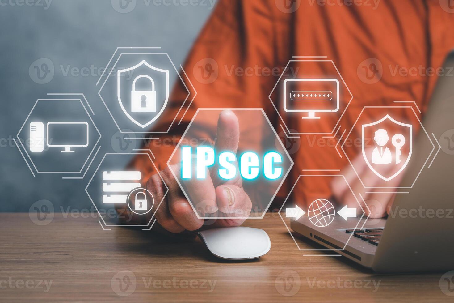 Internet and Protection Network concept, Person using laptop computer and hand touching IPsec icon on virtual screen. Pro Photo