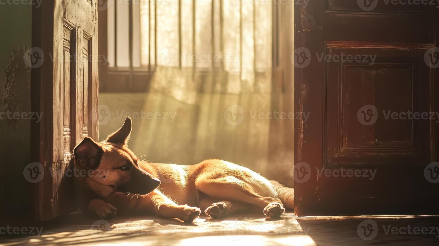 A serene dog rests peacefully by an open door, with soft sunlight streaming through, creating a warm and inviting atmosphere. Pro Photo
