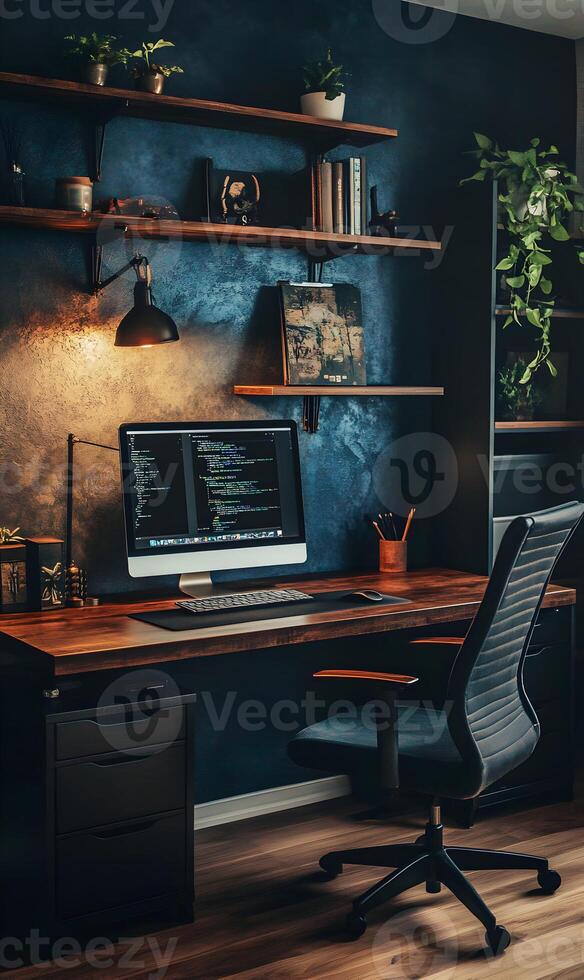 Sophisticated workspace showcasing a desk setup perfect for creative work and coding projects Pro Photo