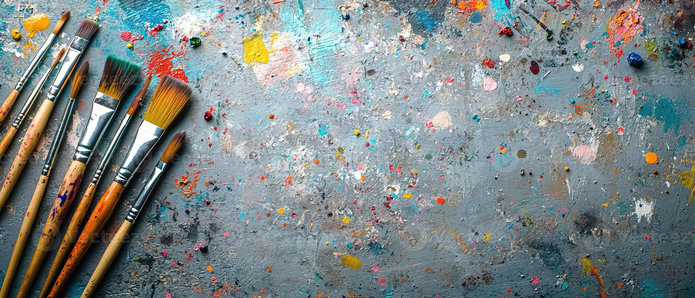 Top View of Various Paintbrushes Arranged on a Grunge Textured Surface with Copy Space Pro Photo
