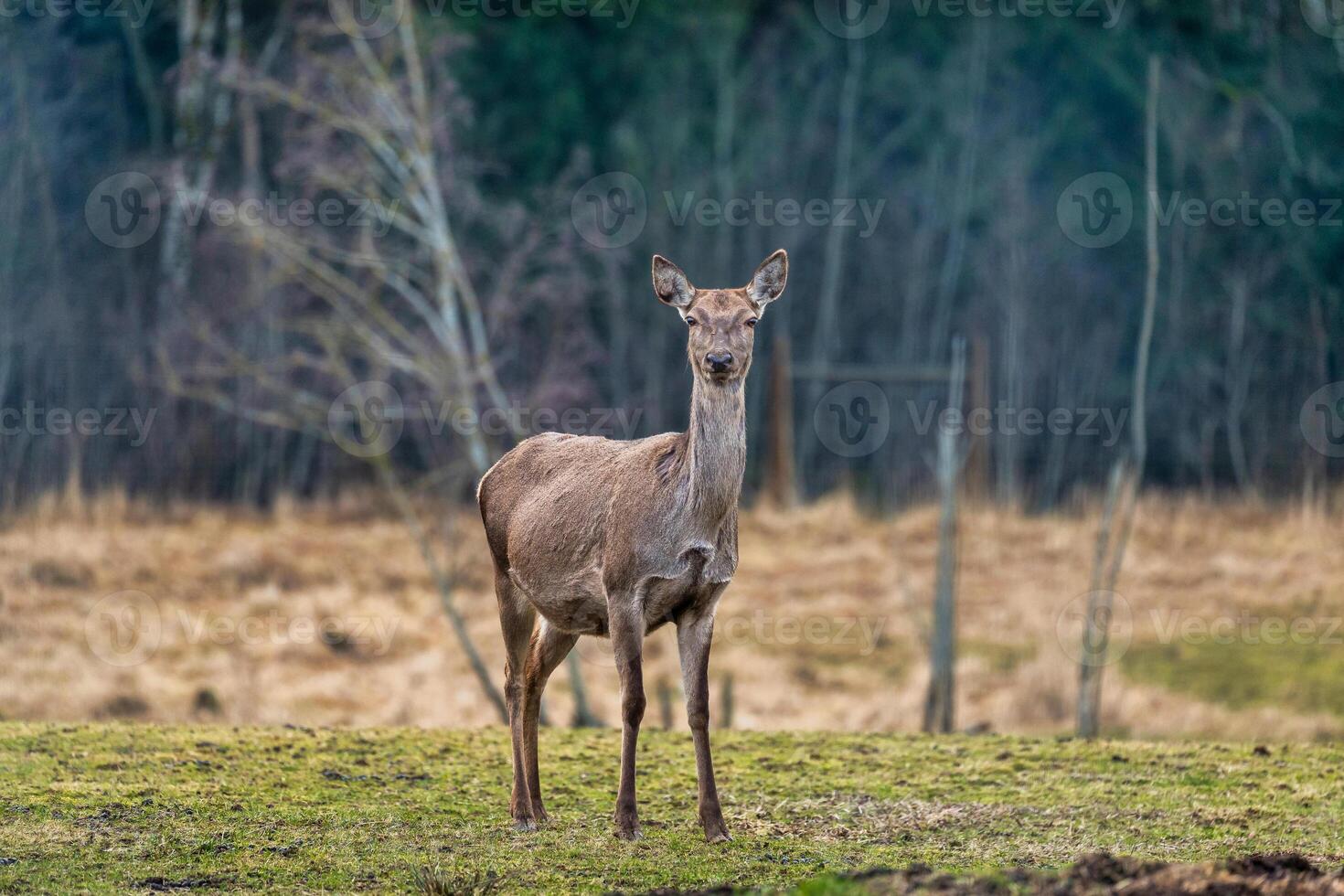 Deer Standing in Open Field with Sparse Grass and Forest Edge Pro Photo