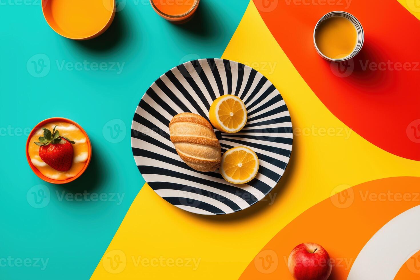 Colorful breakfast layout with fruit, croissant, and juice on geometric patterned background Pro Photo