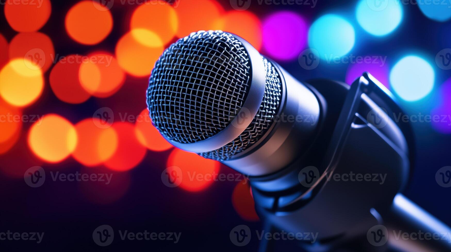 Close-up of studio microphone with colorful bokeh lights in the background Pro Photo