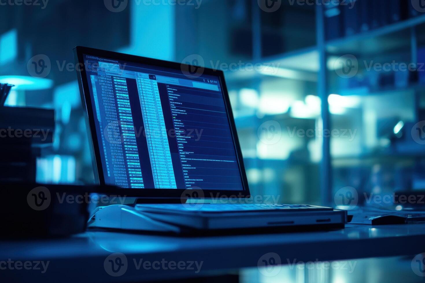 A computer monitor displays a blue screen with a lot of text on it Pro Photo