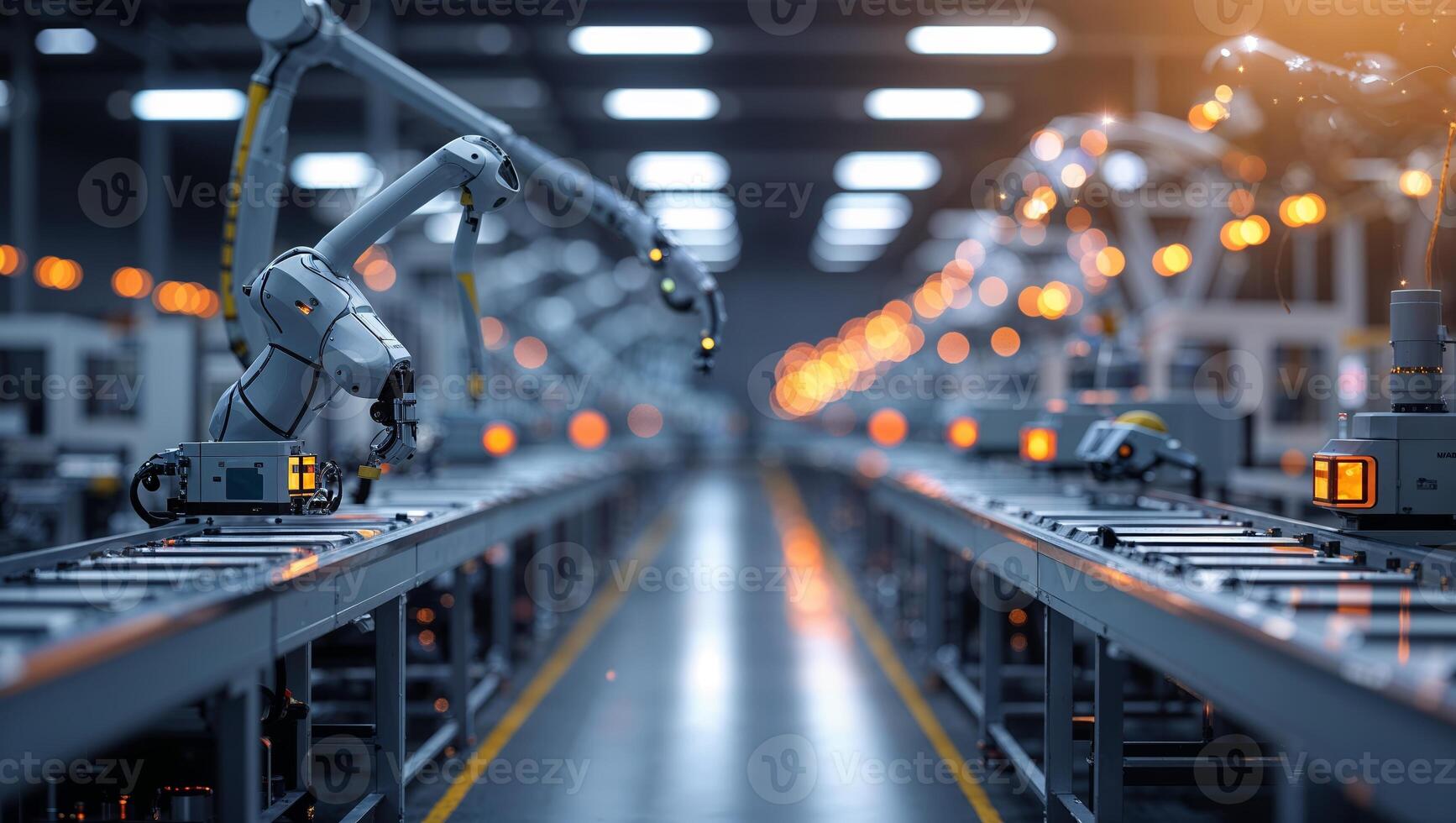 Automated robotic arms working efficiently on an assembly line in a modern factory during the evening hours Pro Photo