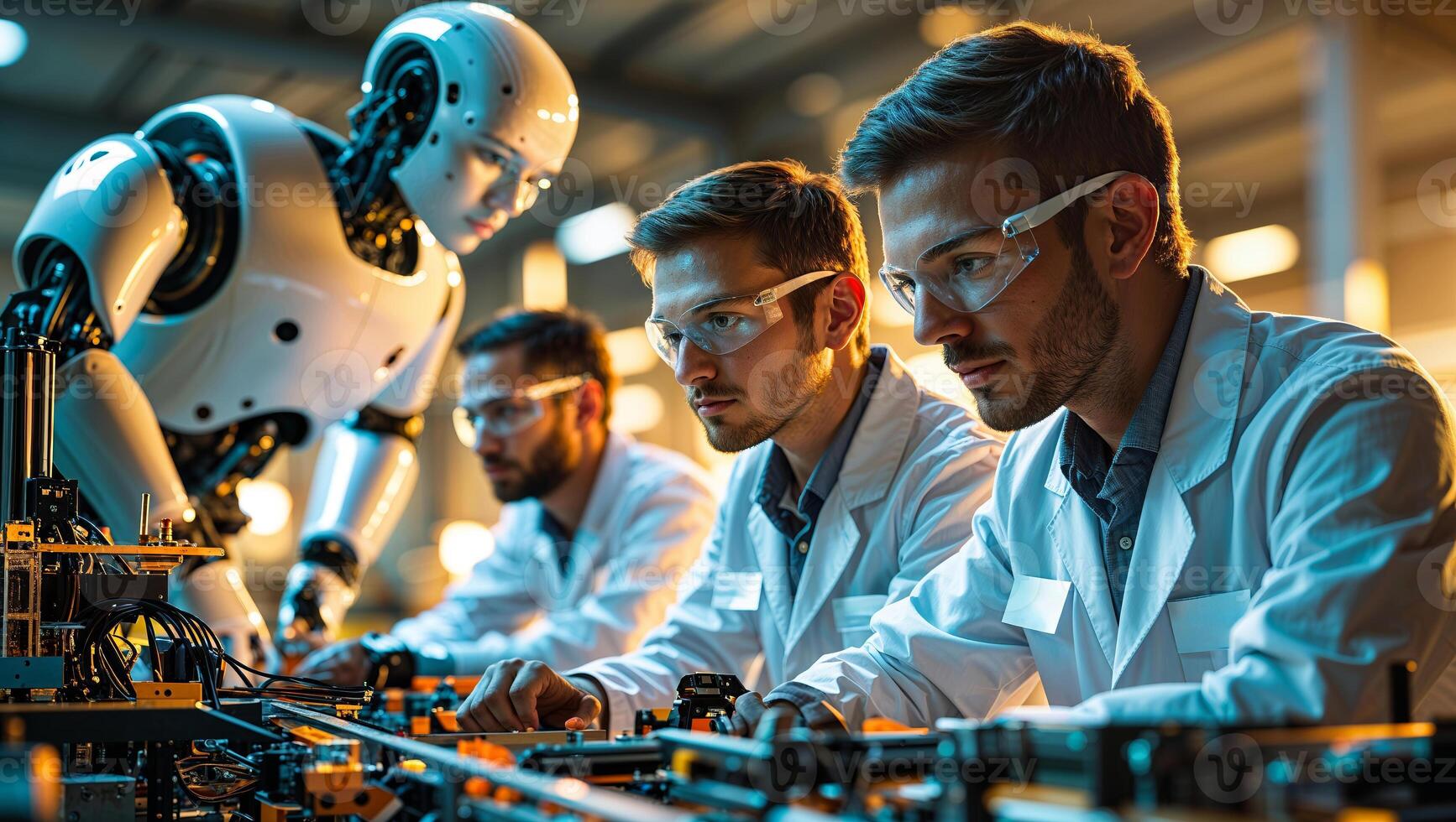 Engineers collaborate with a humanoid robot in a high-tech workshop focused on advanced robotics development Pro Photo