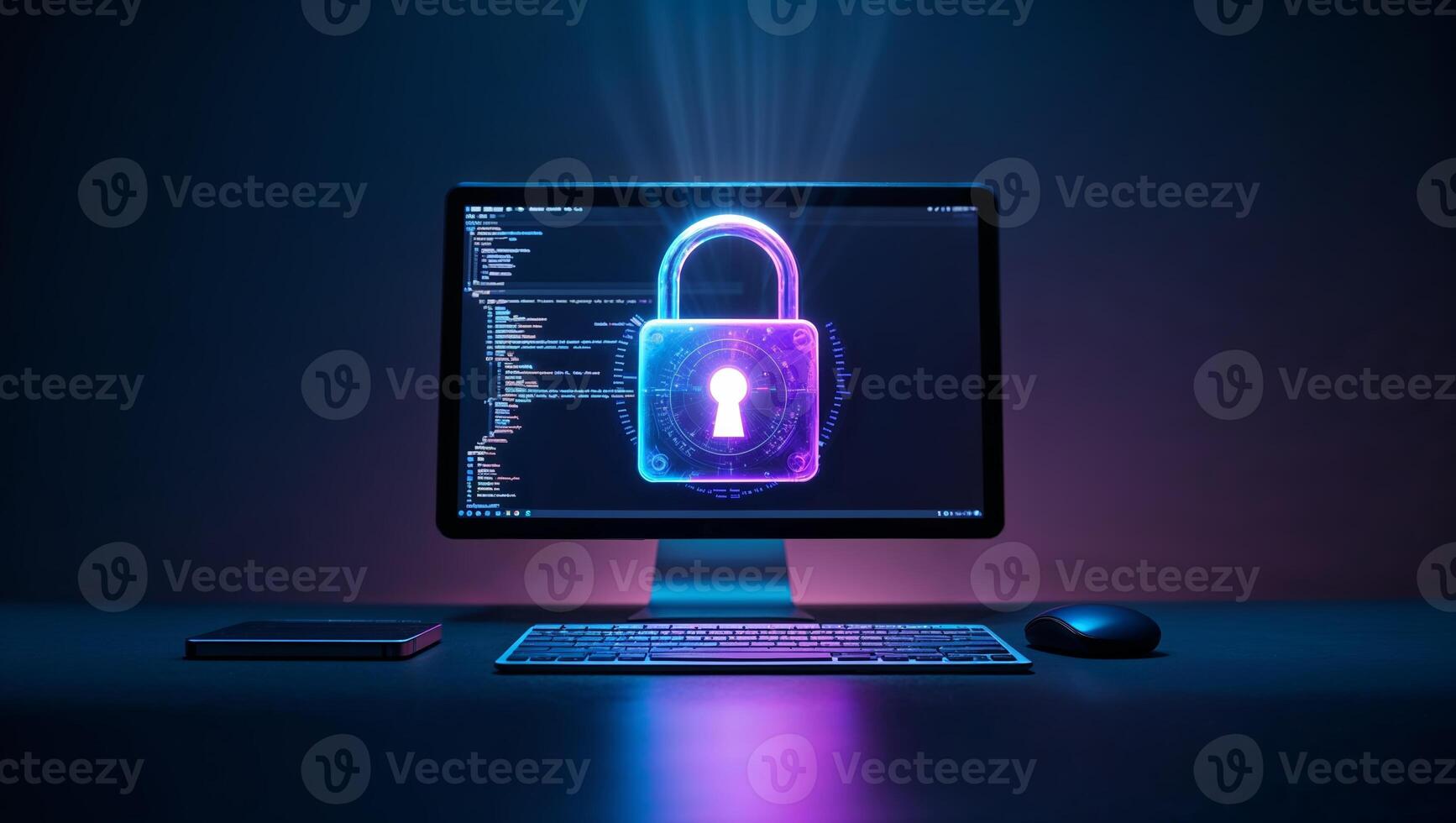 Computer screen displaying digital lock symbolizing cybersecurity with coding background in a dark setting Pro Photo