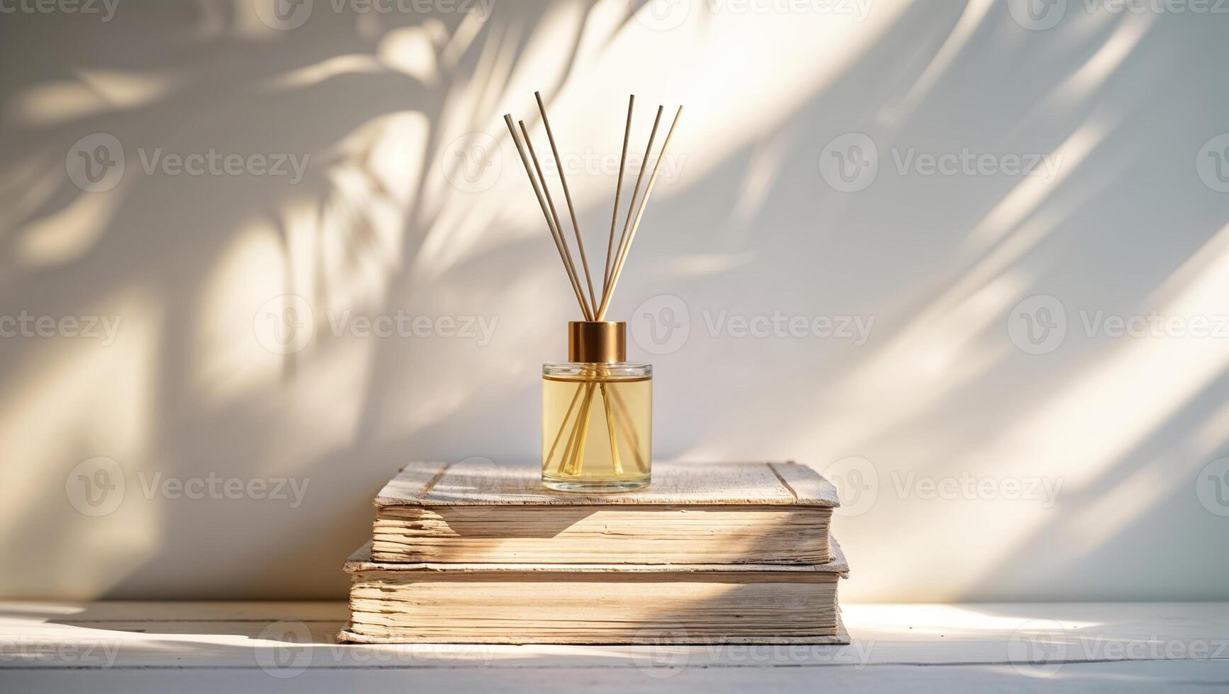 Scented diffuser placed on stacked books with soft light and shadow effects in a cozy setting Pro Photo