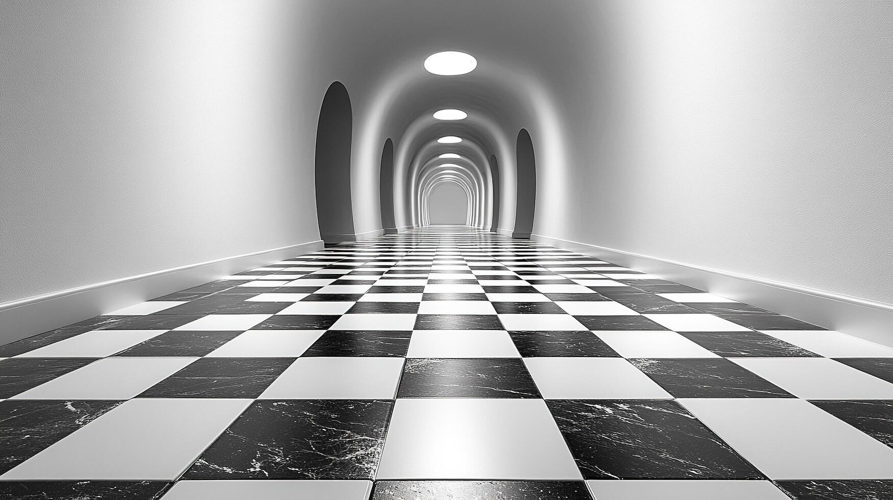 Long, tiled corridor with lit, arched entryways receding into light at end, possible path photo