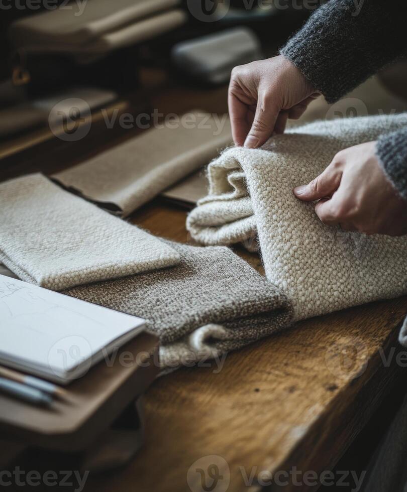 Exploring the texture and quality of boucle fabric during a cozy crafting session at a workshop Pro Photo